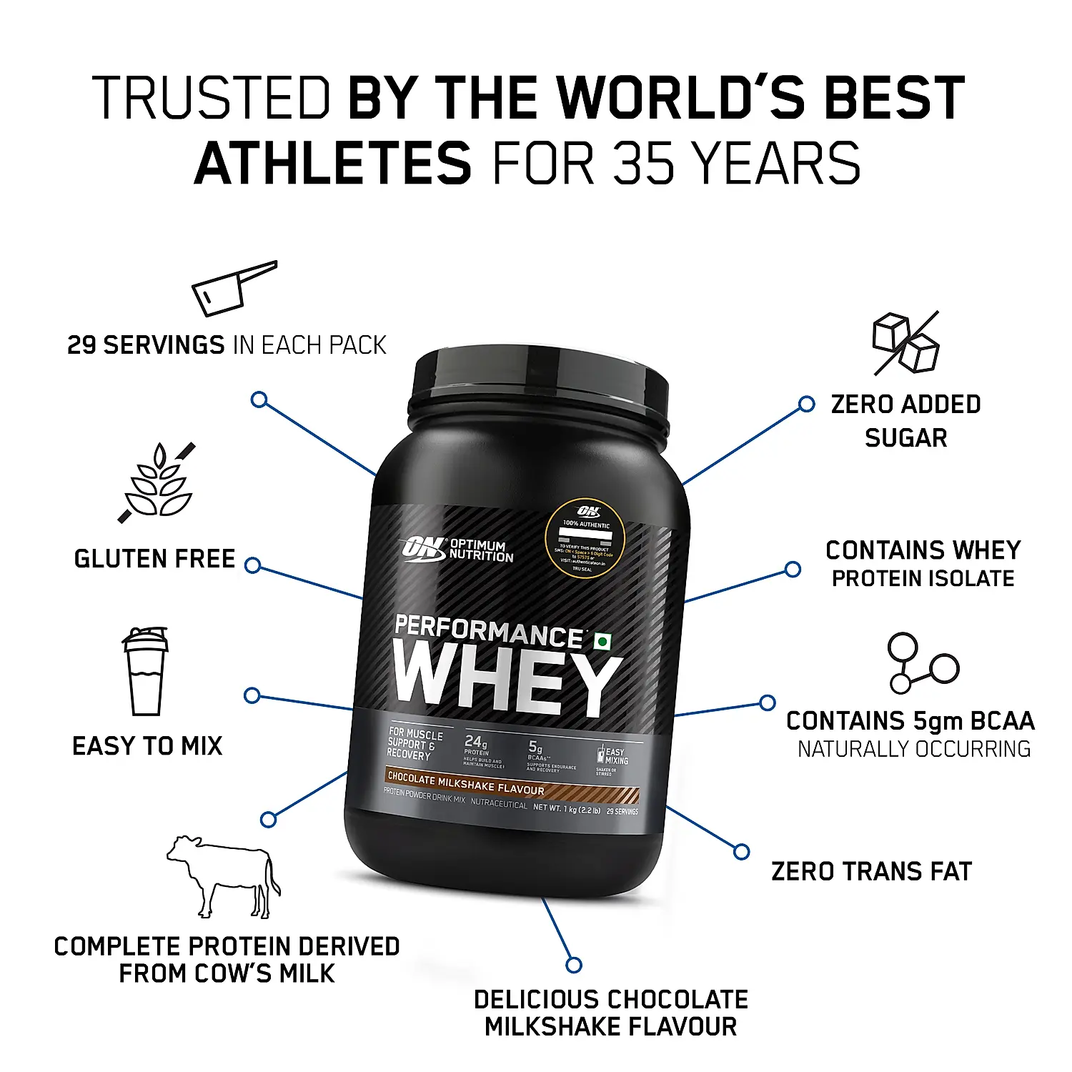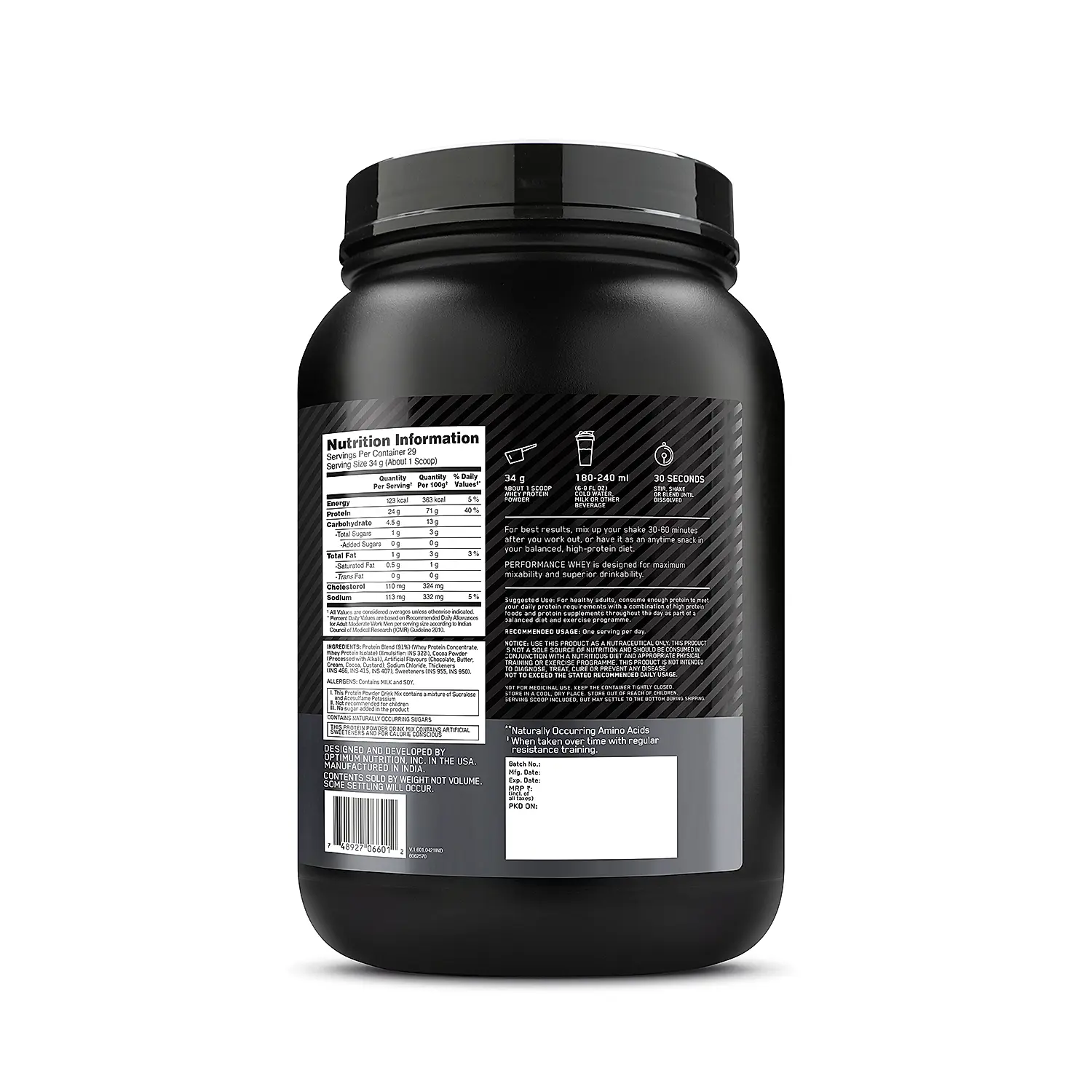 | Key Ingredient(s) | Whey Protein Concentrate (Emulsifier: INS 322(i)), Cocoa Powder (Processed With Alkali), Whey Powder, Fat Powder (Refined Coconut Oil, Glucose Syrup Solids, Milk Solids, Emulsifier (INS 471), Antioxidant (INS 300)), Natural & Artificial Flavors (Chocolate, Vanilla), Vitamins & Minerals (L-Ascorbic Acid, Zinc Gluconate, DL-alpha-tocopheryl Acetate, Pyridoxine Hydrochloride, Retinyl Acetate, N-pteroyl-L-glutamic Acid, Sodium Selenite, D-Biotin, Ergocalciferol), DigeZyme® (0.14%), Sweetener (INS 955), Thickeners (INS 466, INS 415, INS 407). |
